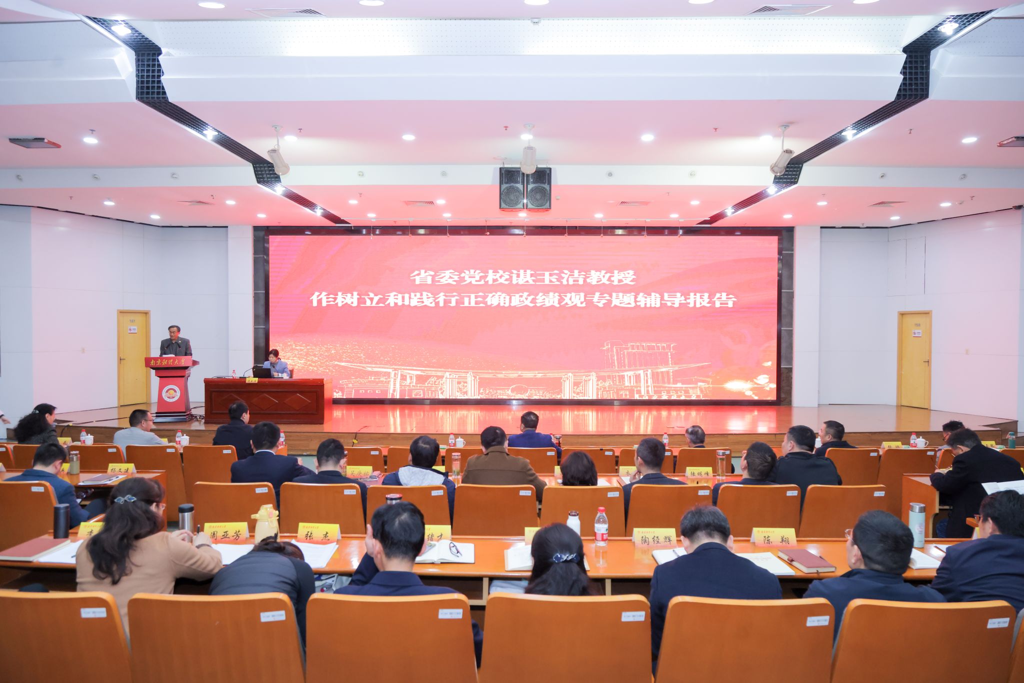 省委党校谌玉洁教授围绕“为人民树政绩 靠实干出政绩——学习贯彻习近平总书记关于树立和践行正确政绩观的重要论述”作专题辅导报告。报告紧扣习近平总书记关于树立和践行正确政绩观的重要论述,从“为何要牢固树立正确政绩观”“把握正确政绩观的精髓要义”“践行正确政绩观的现实要求”三个方面,结合正反两方面典型案例,系统阐释了正确政绩观的理论内涵和实践要求。